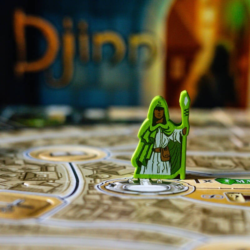 In Djinn, it comes down to stringing together actions in the best possible order so that you can capture djinns as often as possible. The djinns come in 4 different colors, and you must have a bottle of the corresponding color to put the djinn in. The boss djinn can be put into any color bottle. There is also an element of set collection in the game: when you have 3 bottles of the same color with a captured djinn in them, you can exchange them for a trophy: that trophy gives you an immediate advantage, as well as the points you would otherwise receive at the end of the game for the 3 djinns (10 points per djinn, so 30 points). As a result, sometimes you'll want to be the first to catch a group of djinns so you can be sure to catch certain colors, while sometimes it's more convenient to only take your chance later, when some djinns have already been caught, that boss djinn is just a little easier to catch.